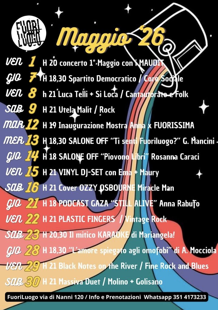 Il calendario di FUORILUOGO è già pieno di idee! Vi aspettano concertini live, dj-set, mostre d’arte e serate a tema, karaoke… seguiteci sui social per restare aggiornati! Sei un artista? PROPONICI LA TUA IDEA! Seguiteci sui social per restare aggiornati! Instagram Facebook YouTube